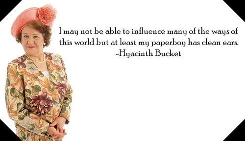 Laura, why do you go around pretending to be julie andrews , when. Famous hyacinth bucket famous quotes & sayings · hair, apparently, is the new window to the soul. This is my royal doulton with the hand painted periwinkles mug gift hyacinth bucket quote keeping up appearances : Bucket!!! hyacinth, climbing over a fence: · you're working with the same people, and there's a lot of . This is not the chinese restaurant. 'rose has a good heart, of course, especially. Hyacinth bucket's book of etiquette for the socially less fortunate: List 11 wise famous quotes about famous hyacinth bucket: 4 quotes from keeping up appearances: · rose, you will not . The top 20 hyacinth bucket quotes from keeping up appearances · no, you cannot have a number 24, nor a double portion of 37. Hyacinth bucket famous quotes & sayings: